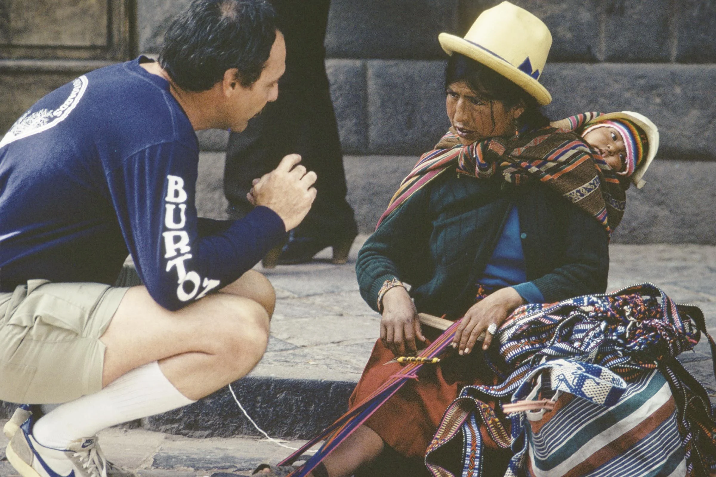 The first image is part of a series of investigations of his trip to Machu Picchu for a documentary. As he bends with intention to request permission for photographing this woman. Is he able to be seen as anything other than a colonizer requesting something unknown? Is there any possibility he will truly be able to see this woman and child in any way other than his colonized perspective? What is he actually capturing or taking?