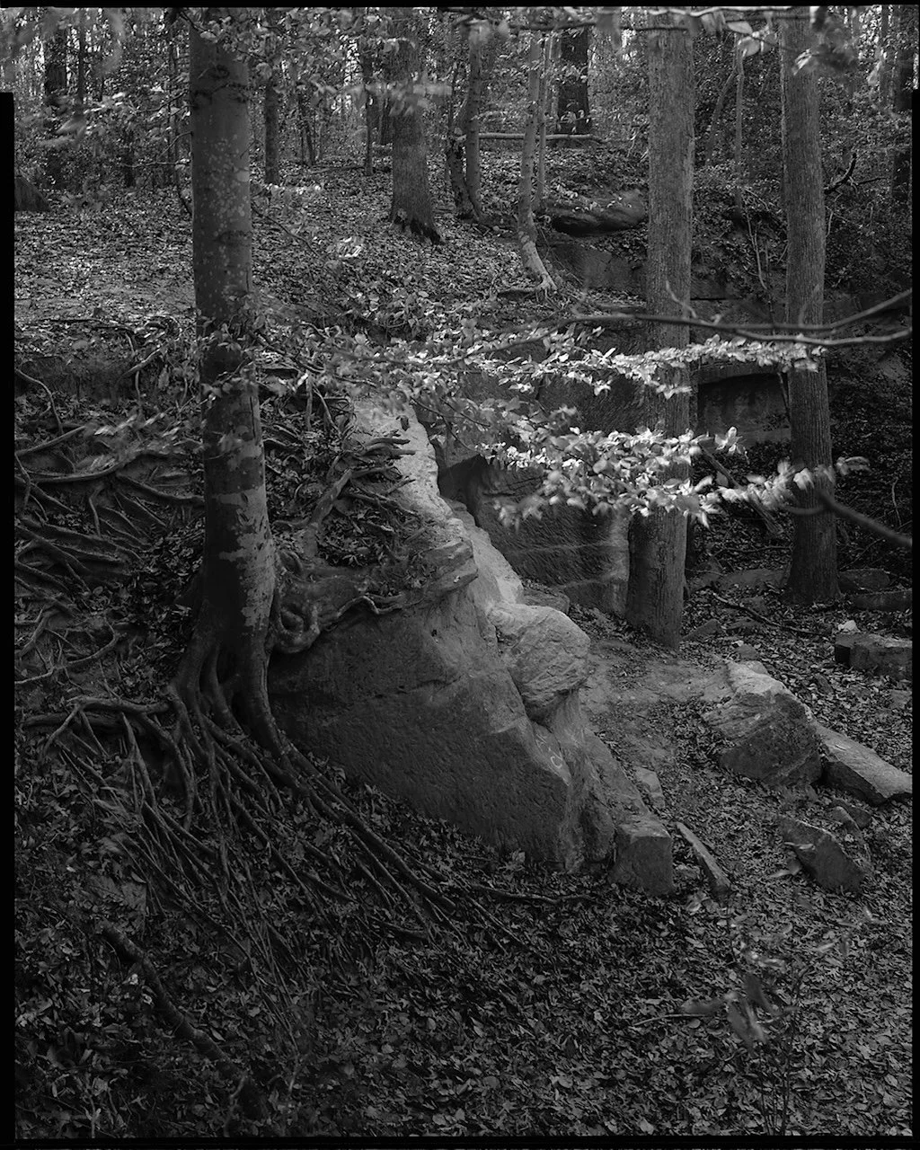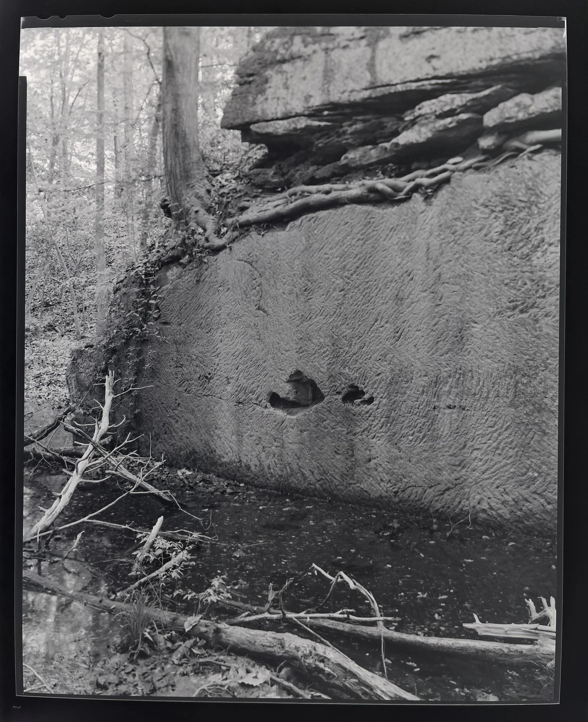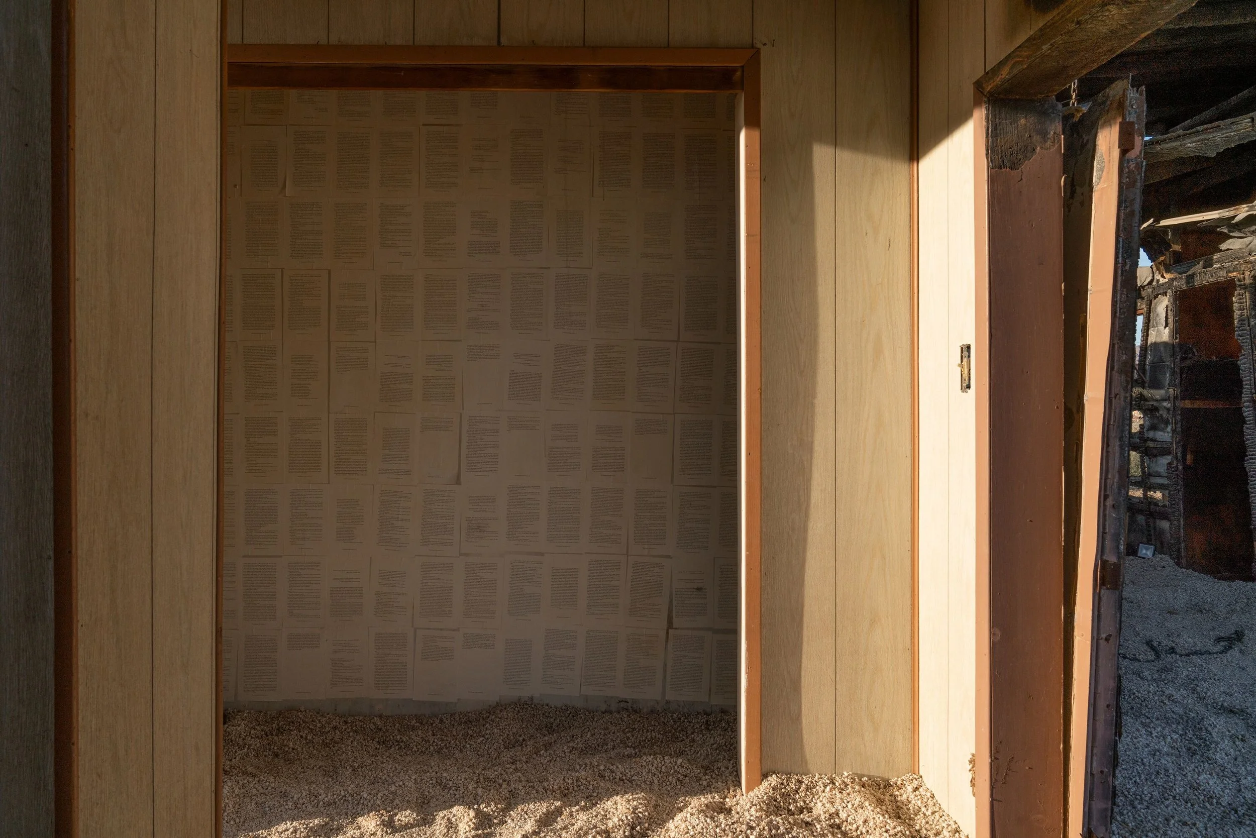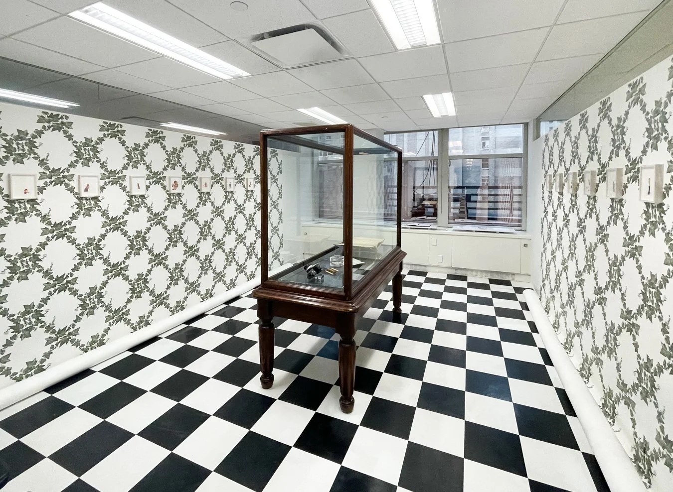 Formally, a multitude of references cascade throughout this work. On the walls, the negative space of small-scale prints from a family album depicting a child, a young white male body, have been etched out to reveal a white ground. These personal images of the artist himself are mounted among English Ivy toile wallpaper, first introduced in the 18th century, and recreated for this exhibition. In its initial form, the wallpaper was found to be a toxic material due to the pigments, and the ivy itself became an invasive species. In the middle of the room, sits a vitrine that was once used in the V&A Museum in London, and holds many of the tools used to etch the photographs, along with remnants of removal. It also includes the 35mm camera used to capture the images, and a family album. The formal analogues to renaissance moments are abundant, but it is the space between them that the conceptual analogue truly takes hold. All together, they resonate as a foregrounding of the gaze, a subtly disquieting review of surroundings that shape and inform the strangeness of looking, while provoking a clear eyed critique of white supremacy.